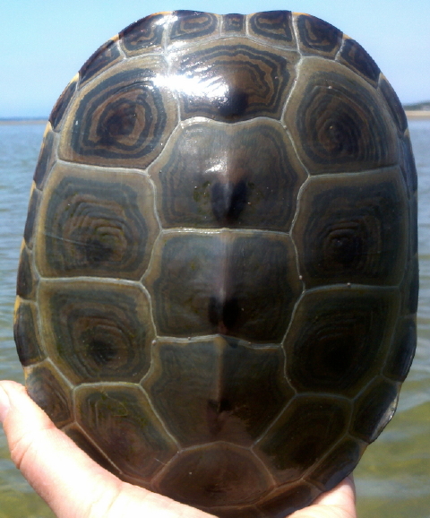 Yes, SPRINGTIME is finally here for the resident diamondback terrapins of Outer Cape Cod. On Tuesday, Turtle Journal’s Sue Wieber Nourse ventured to the Fresh Brook Run in South Wellfleet wedged between Lieutenant Island to the north and Mass Audubon’s Wellfleet Bay Wildlife Sanctuary to the south. Temperatures finally had risen from the mid 40s to the low 60s with the threat of spring thunderstorms. As Sue waded into the still chilly waters, she was greeted by pairs of smiling terrapins who were much too occupied with each other to realize a turtle researcher had approached with a large collection net.