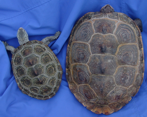 Marking a great start to the new research season, Sue captured four pairs of mature diamondback terrapins in the low tide drained Run. Of the four females, one was a recapture: terrapin #9268, a 14-year-old female whom we had first netted in May 2009. The others were first timers who had managed to escape our researchers for the last decade. Of the four males, we had previously seen three in the Run, and one was a first time capture. The adorable couple imaged above clearly illustrate “gender dimorphism” in diamondback terrapins. That’s a fancy way of saying that females are bigger than males, a lot bigger. In maturity, females are four times the mass and twice the length of males.