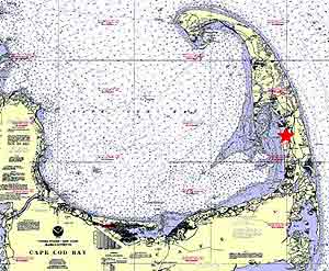 The red star marks the location of the Fox Island Wildlife Management Area, Cape Cod, Massachusetts.