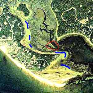 In this aerial view of the Fox Island Wildlife Management Area, the obstructions were located within the red circle; the main sites where turtle remains were recovered are in blue.