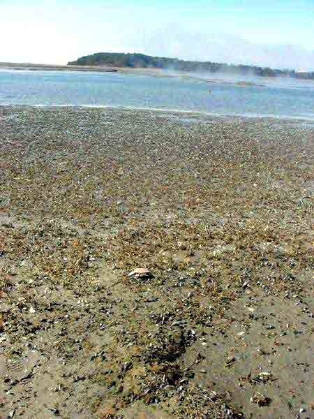 Another perspective of the Fox Island marsh at mid-tide on 23 March as fog rises from the creek when fanned by a stiff northerly breeze. The plastron-up turtle remains in the foreground was an eight-year-old female, 16.4 cm carapace length.