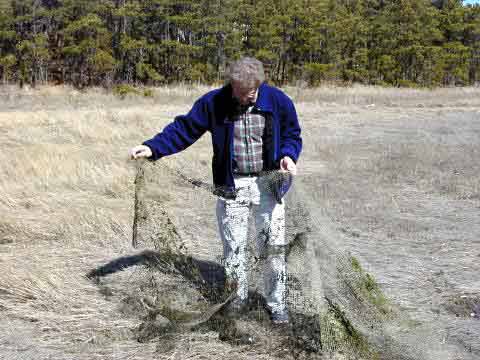 Bob Prescott, director of Massachusetts Audubons Wellfleet Bay Wildlife Sanctuary, examines second netting obstruction removed from a side channel in the Fox Island marsh.